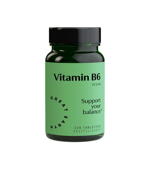 Great EarthKosttillskott för hormonbalans Vitamin B6, pyridoxin, bidrar till normal protein- och glykogenomsättning och bidrar till immunsystemets normala f...