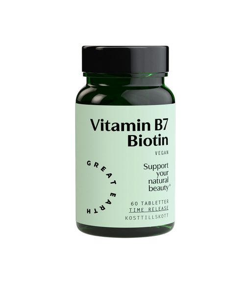 Great EarthKosttillskott för håret Biotin bidrar till att bibehålla normalt hår och normal hud. Bra för hår, hud och slemhinnor En tablett innan maten rä...