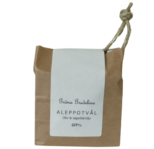 Aleppotvål 40% från Gröna Gredelina är handkokt, soltorkad (9 mån) och handskuren. Kommer med ett kraftigt snöre i sisal för praktisk upphängning o...