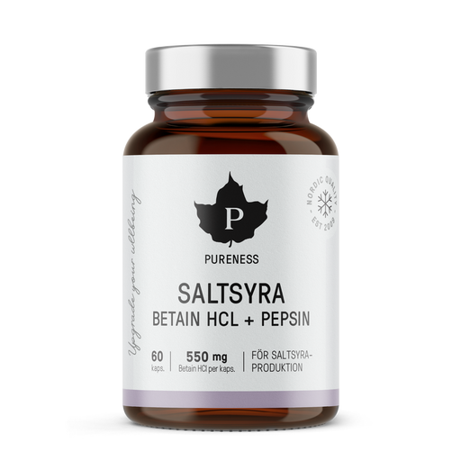 PurenessPureness saltsyrakapslar med Betain HCl och pepsin effektiviserar kroppens egen produktion av saltsyra. Dessutom bidrar den till bearbetningen av n...