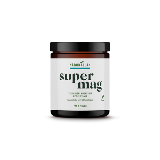NärokällanSuper Mag pulver från Närokällan. 3 olika former av magnesium i lättlöslig pulverform. Innehåller även C-vitamin.