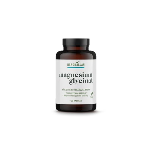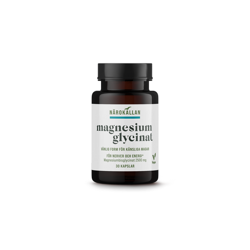 NärokällanMagnesiumglycinat är ett vänligare alternativ för magen. Vissa kan vara känsliga för magnesium och då passar magnesiumglycinat utmärkt. FormKapslar...