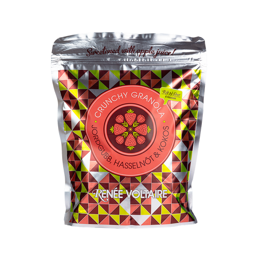 Renee VoltaireVegansk krispig granola på havre smaksatt med jordgubb, hasselnöt och kokoschips på noga utvalda råvaror – naturlig smak, crunchy textur och gyllen...